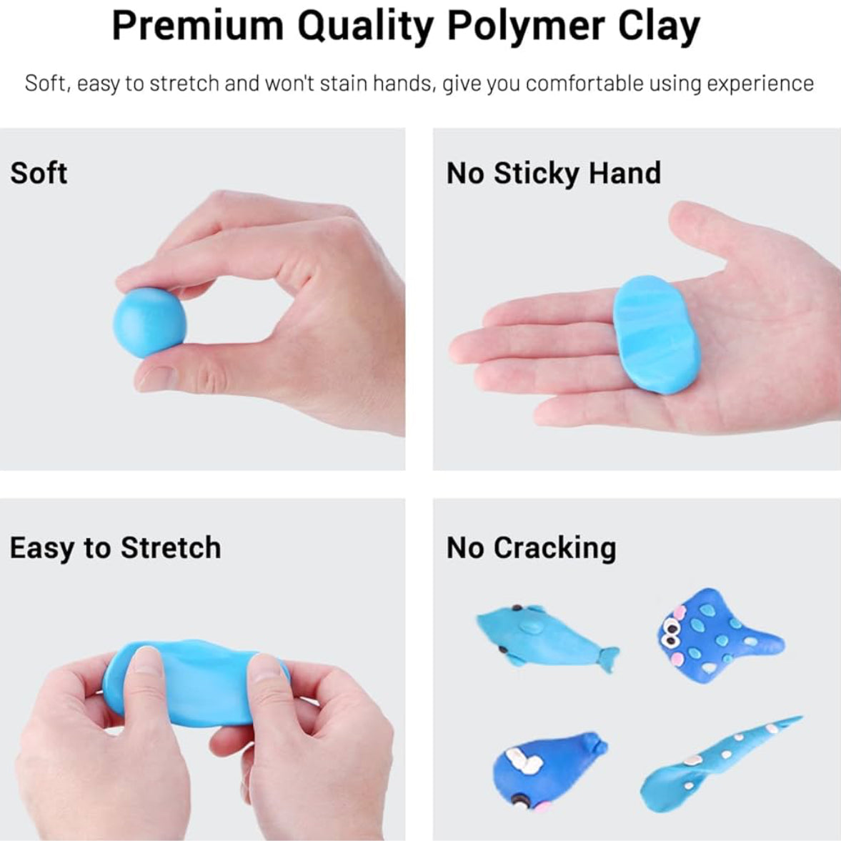 Der Ton ist weich, flexibel, leicht zu formen und härtet nach dem Backen stabil aus. Die Farben bleiben kräftig, bröckeln nicht und verlieren nicht ihre Qualität. Perfekt für Anfänger, Fortgeschrittene und professionelle Künstler.