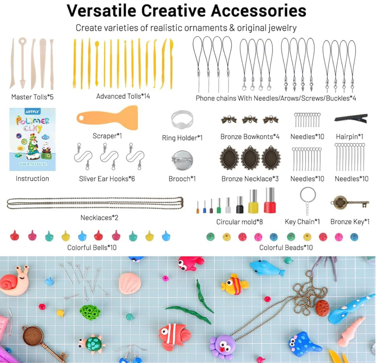Dieses hochwertige ARTFLY-Set wurde speziell für kreative Arbeiten wie Schmuckdesign, Modellbau, Miniaturen, Figuren, Deko-Objekte und DIY-Projekte entwickelt. Es beinhaltet 112 kräftige Farben Polymer-Clay sowie ein umfangreiches Set aus Werkzeugen, Formen und Schmuckzubehör.