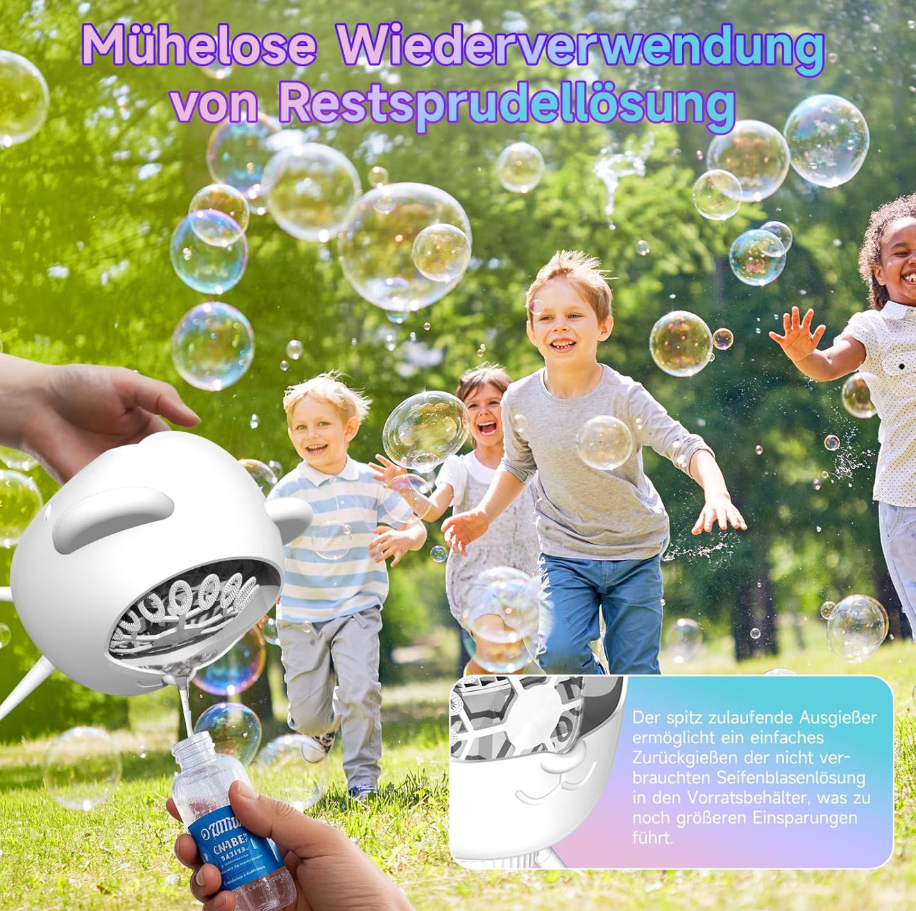 • Großer 500 ml Seifenblasenbehälter: Bietet bis zu 45 Minuten ununterbrochenen Spaß ohne häufiges Nachfüllen.