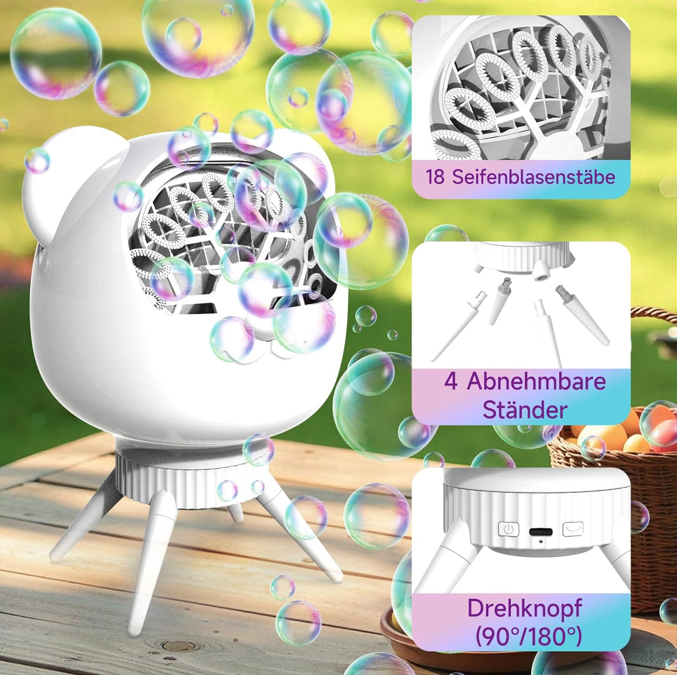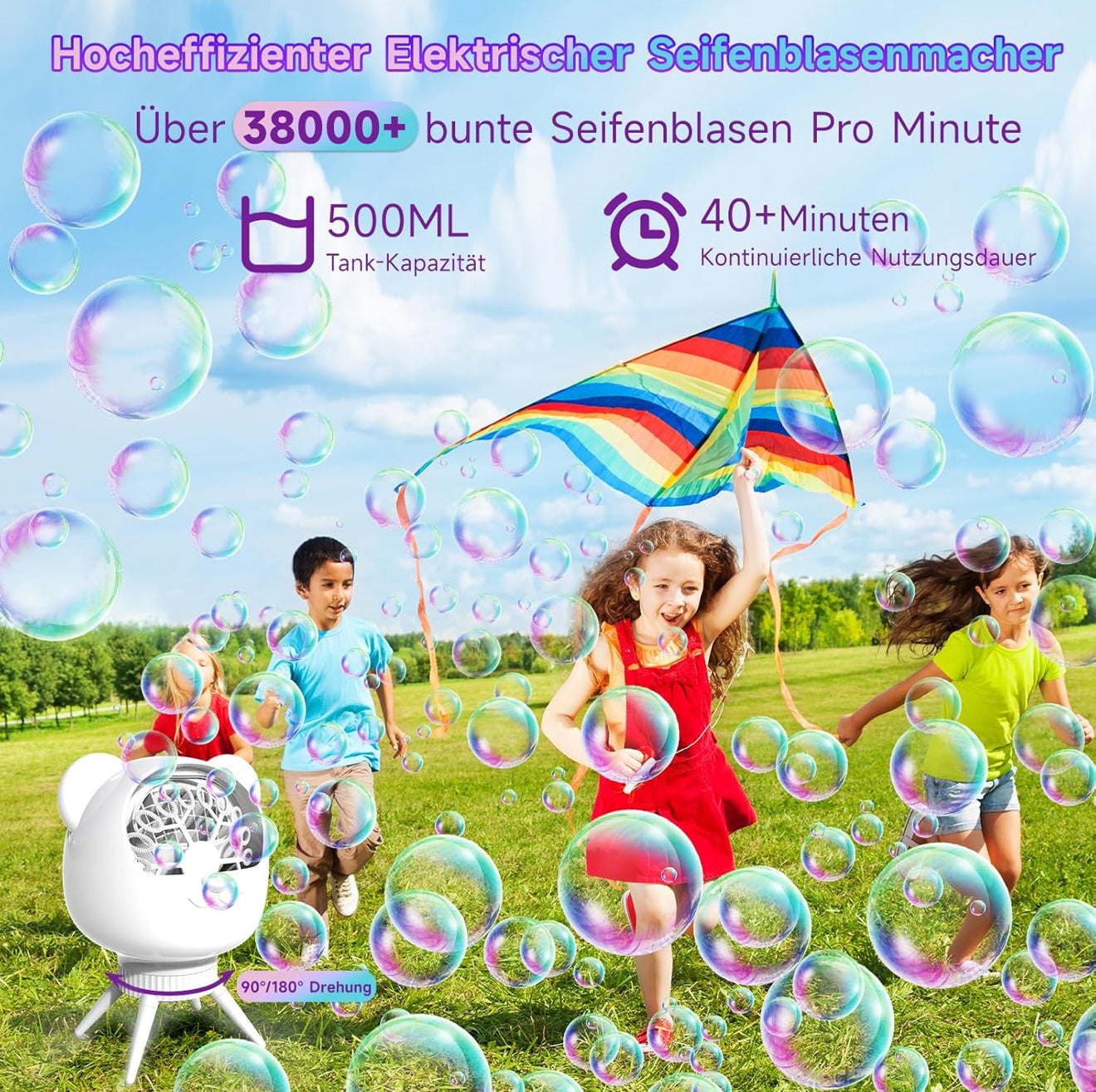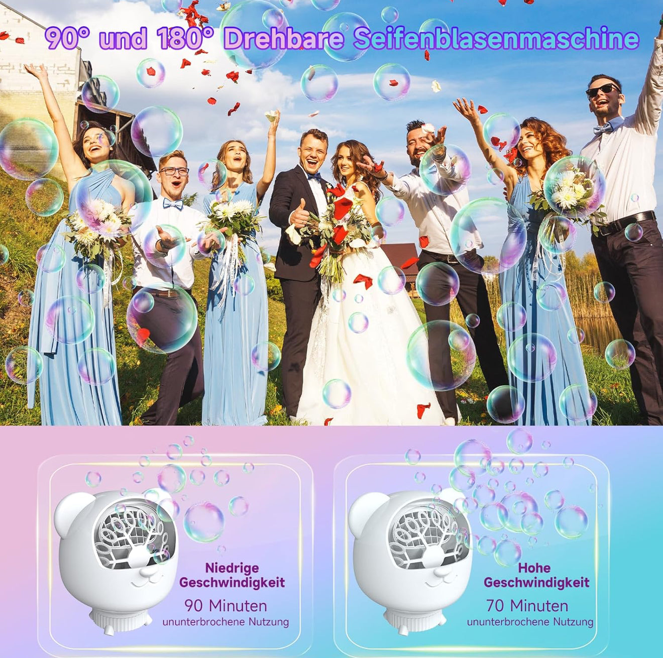 • Drehbarer Blasenwinkel 90°/180°: Gleichmäßige Blasenverteilung und beeindruckende Reichweite für Partys, Hochzeiten oder Gartenfeiern.