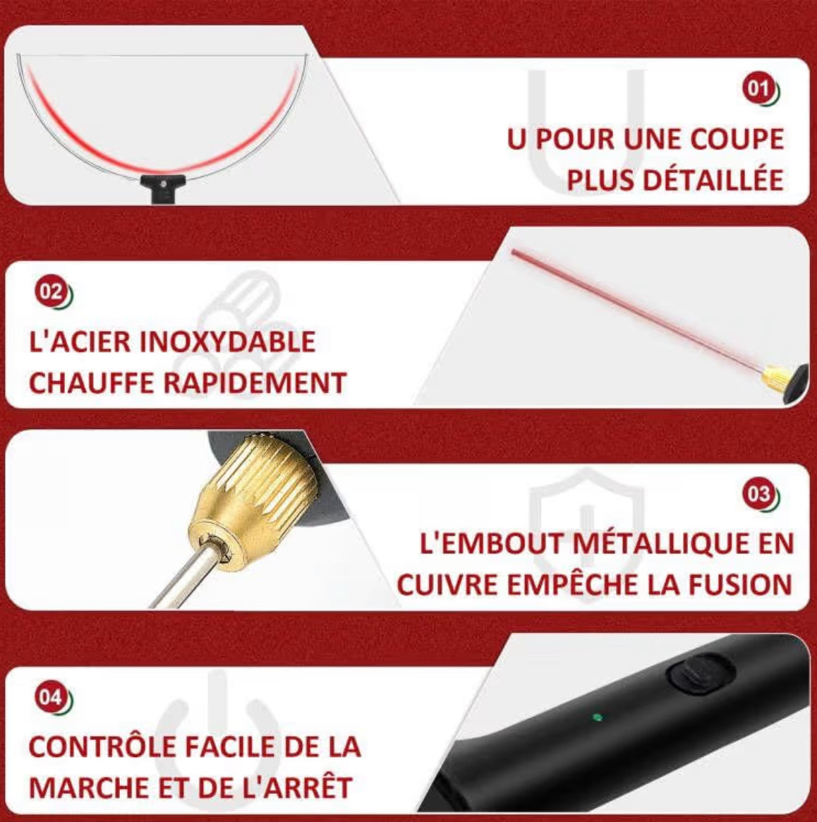 Der Heißdraht erreicht innerhalb von ca. 10 Sekunden Temperaturen bis zu 100 °C, wodurch Materialien gleichmäßig, glatt und ohne Krümelbildung geschnitten werden können.