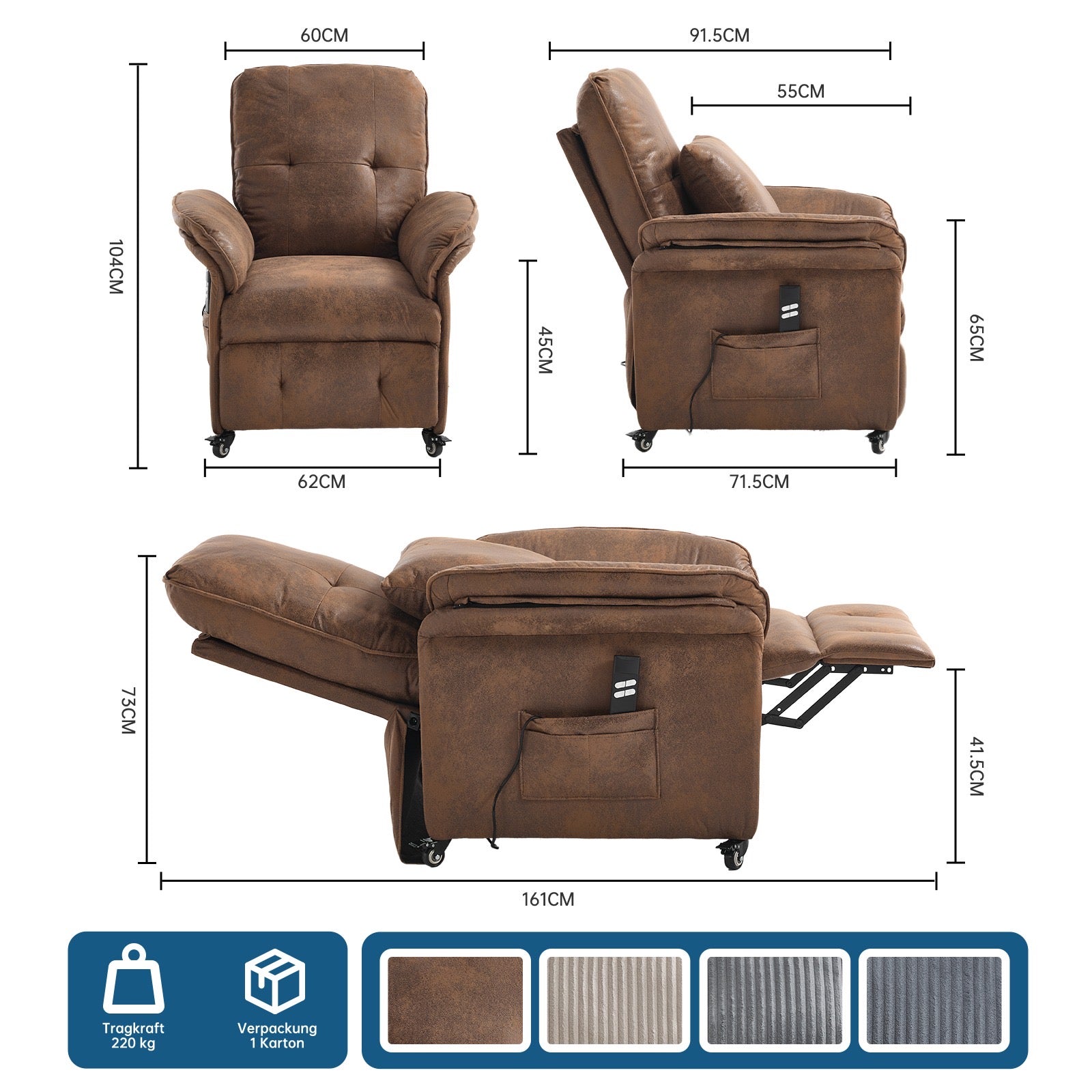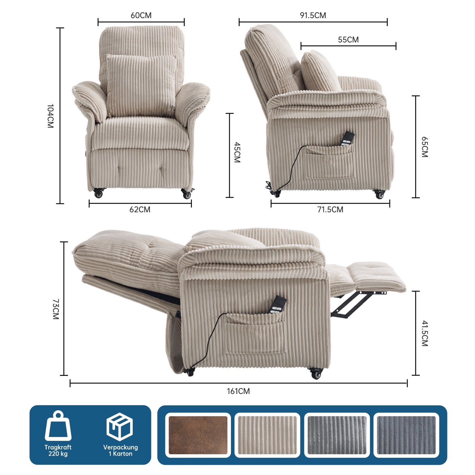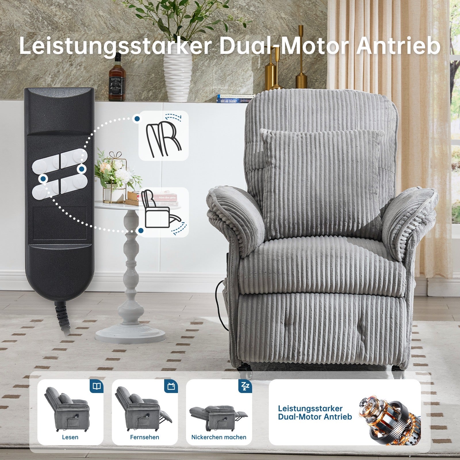 Dieser Sessel vereint höchsten Komfort, moderne Technik und stilvolles Design. Mit seinem leistungsstarken Doppelmotor, der weichen Polsterung und den praktischen Extras ist er die perfekte Wahl zum Entspannen, Lesen oder Fernsehen.