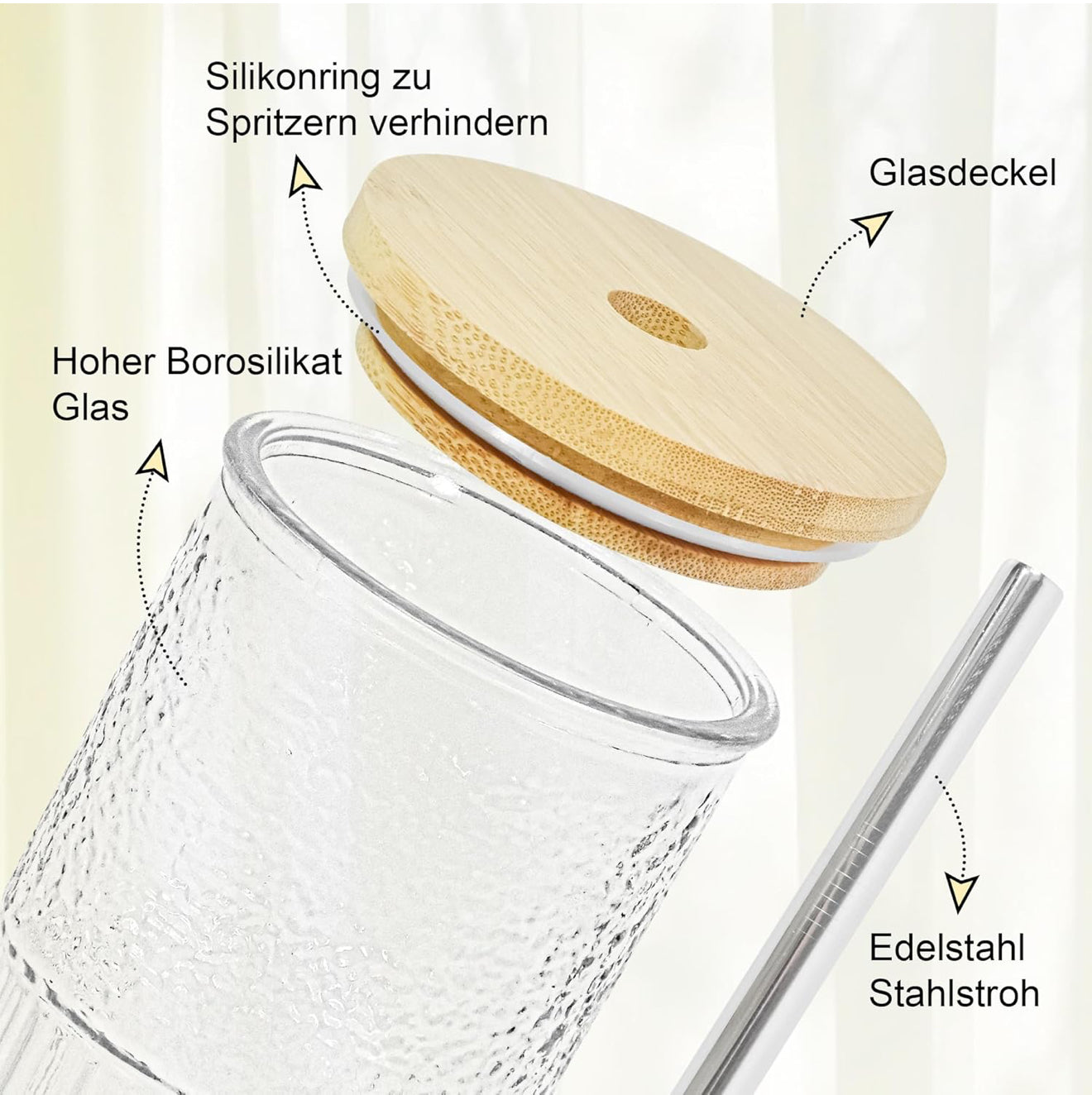 • Besondere Merkmale: Geriffeltes Glasdesign, Silikon-Dichtungsring, hitzebeständig, spülmaschinenfest, BPA-frei, wiederverwendbar