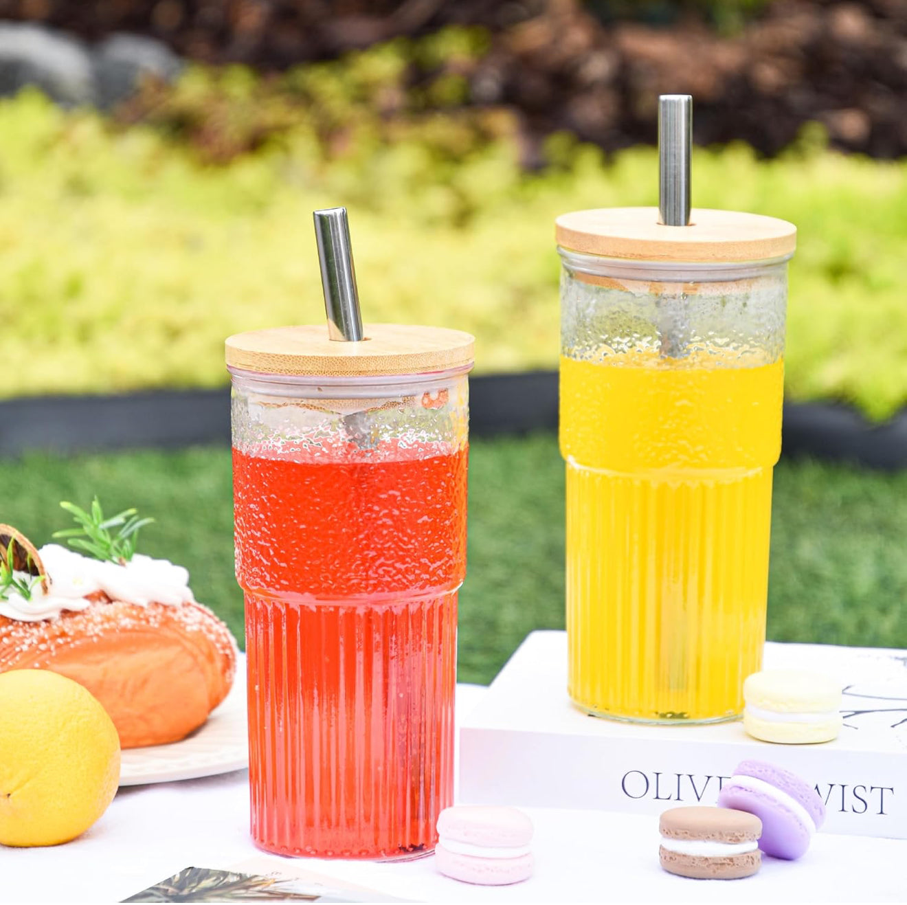 2x 600ml Boba Cup Glas Trinkbecher mit Bambusdeckel & Edelstahl Stronhalm Set