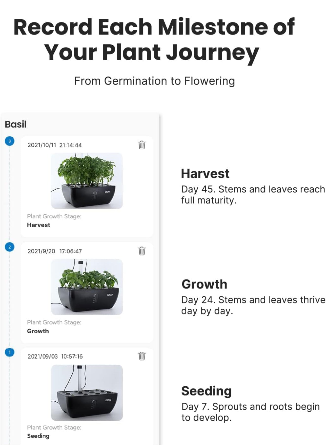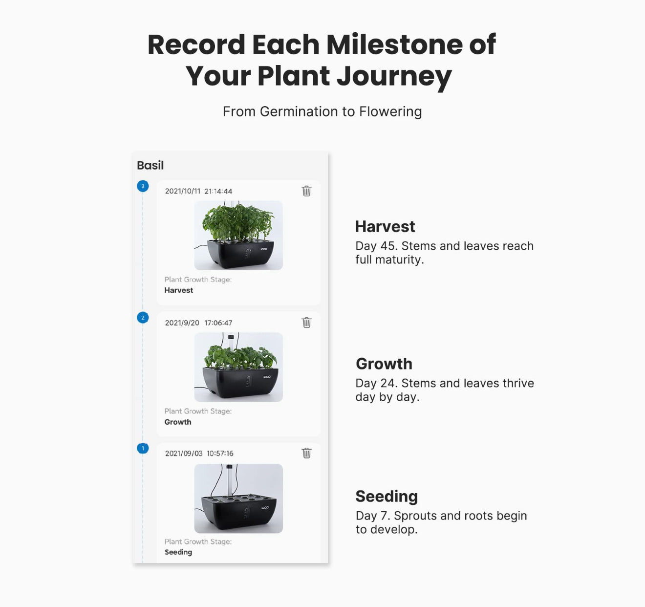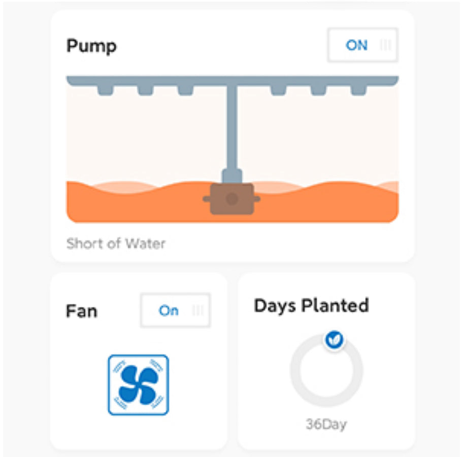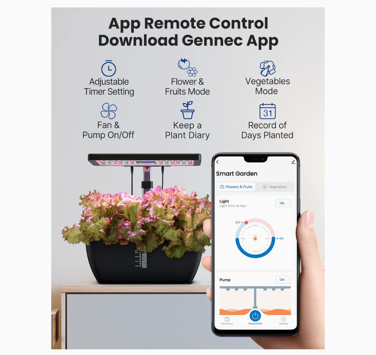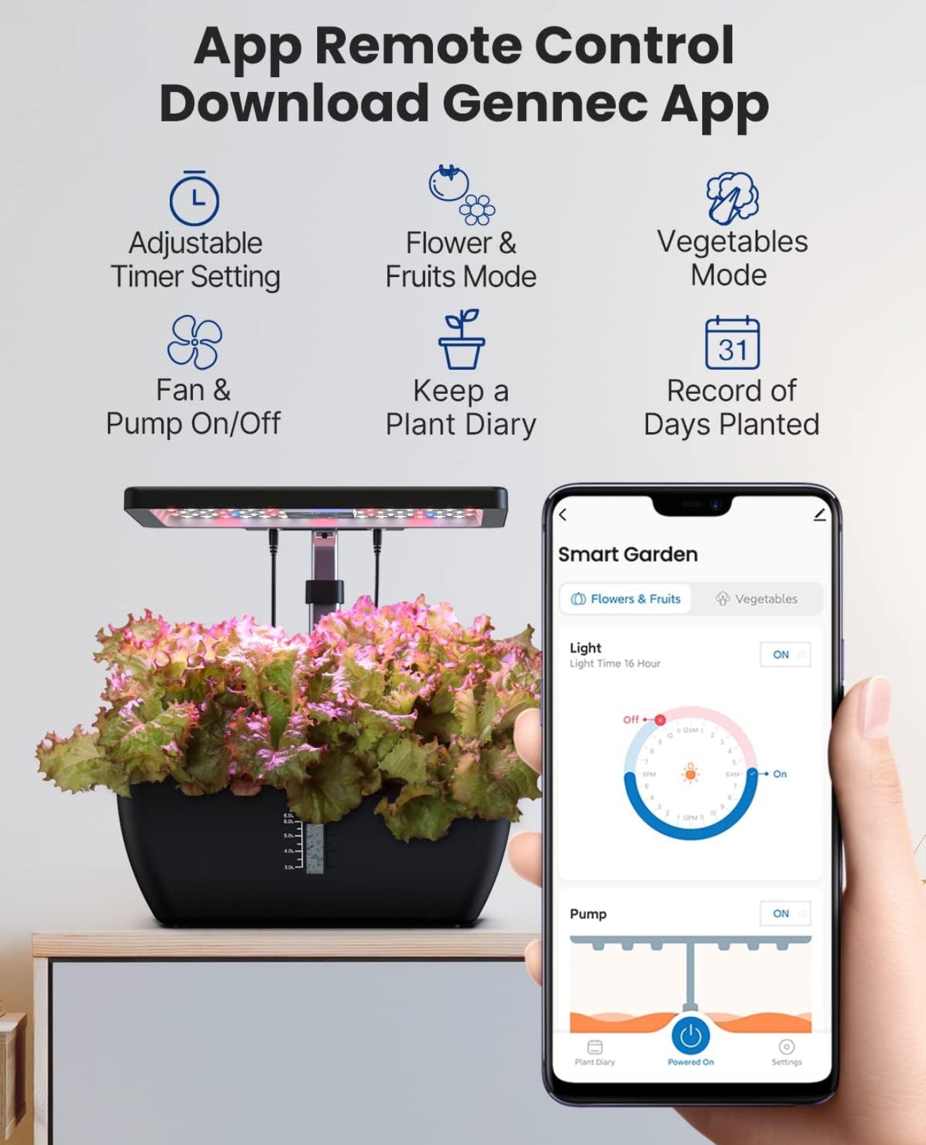 Steuern Sie die LED-Lampe, Wasserpumpe und den Ventilator bequem über die „Gennec“-App. Legen Sie Beleuchtungszeiten, Pumpenlaufzeiten und Lüfterbetrieb individuell fest. Verfolgen Sie das Wachstum jeder Pflanze und genießen Sie maximale Kontrolle, auch wenn Sie nicht zu Hause sind. (Nur kompatibel mit 2,4 GHz Netzwerken)